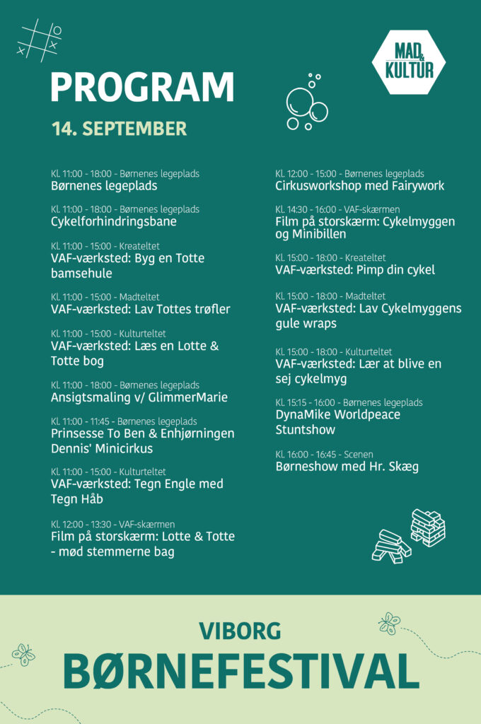 Glæd jer til en sprudlende festivaldag fyldt med leg, fantasi og oplevelser i børnehøjde. Vi har sammensat et program med alt fra kreative værksteder og animationsfilm på storskærm til sjove shows og et festligt børneshow med Hr. Skæg på scenen.