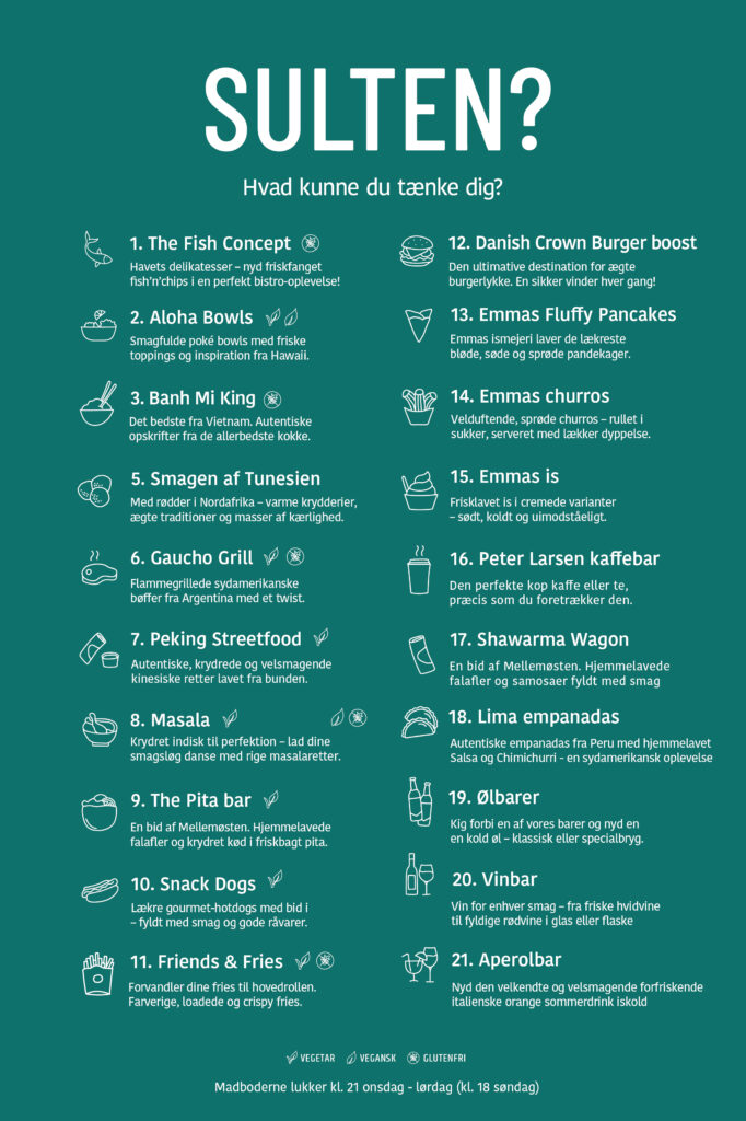(Madboderne lukker kl. 21.00 alle dage, undtagen søndag, hvor de lukker kl. 18)
