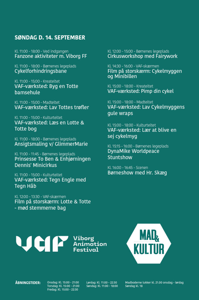 Foruden madboder vil festivalen have flere forskellige barer med specialøl, sodavand, cocktails og vin. Dertil vil der være gratis underholdning, koncerter og shows for både børn og voksne – og selvfølgelig masser af animation og visuelle oplevelser i anledning af Viborg Animation Festival.